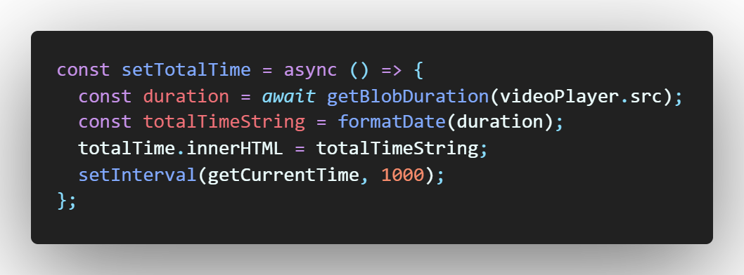 formatDate(duration)으로 구한 영상 길이는 totalTime.innerHTML을 이용하여 값을 설정한다. 그리고 영상의 현재 시간은 setInterval(getCurrentTime, 1000)으로 매 초마다 갱신한다.