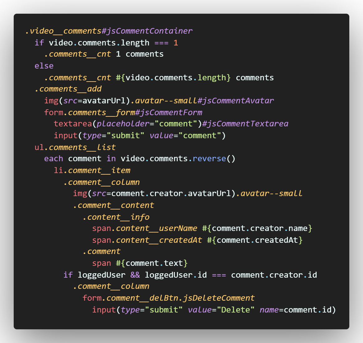 videoDetail.pug에 comment 관련 코드를 추가했다.