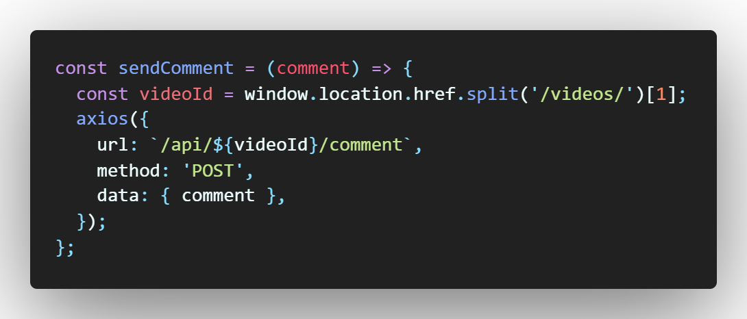 handleCommentSubmit() Register view와 거의 똑같다. axios로 data:{ comment }를 통해서 server에 comment를 전송할 수 있다.