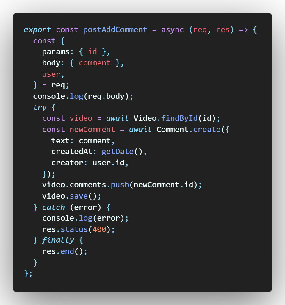 req.params.id는 url 경로에서 :id 값을 가져온다. 해당 id 값은 videoId 값이다. 이 값으로 DB에서 video를 찾는다. Front-end로 받은 data를 토대로 newComment를 만들고 이것의 id 값을 video.comment에 추가하고 save()한다. 단지 video.comments.pus()만 하면 DB에 저장이 안 되므로 video.save()를 꼭 해주자.