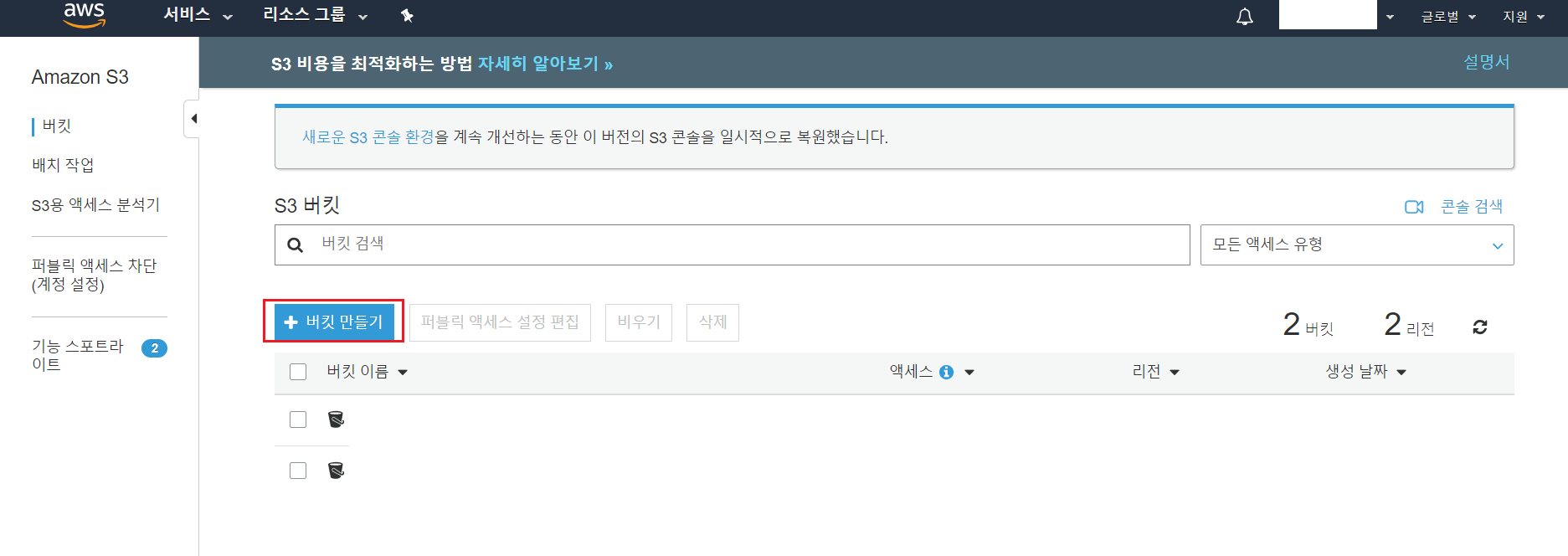 나는 예전에 미리 생성해 둔 bucket이 2개가 있다. 우리가 할 것은 +버킷 만들기다. 새로운 bucket을 생성하자. 여기서 bucket이란 파일을 업로드할 공간을 뜻한다. 우리는 새로 생성한 bucket에 video와 avatar를 저장할 것이다.