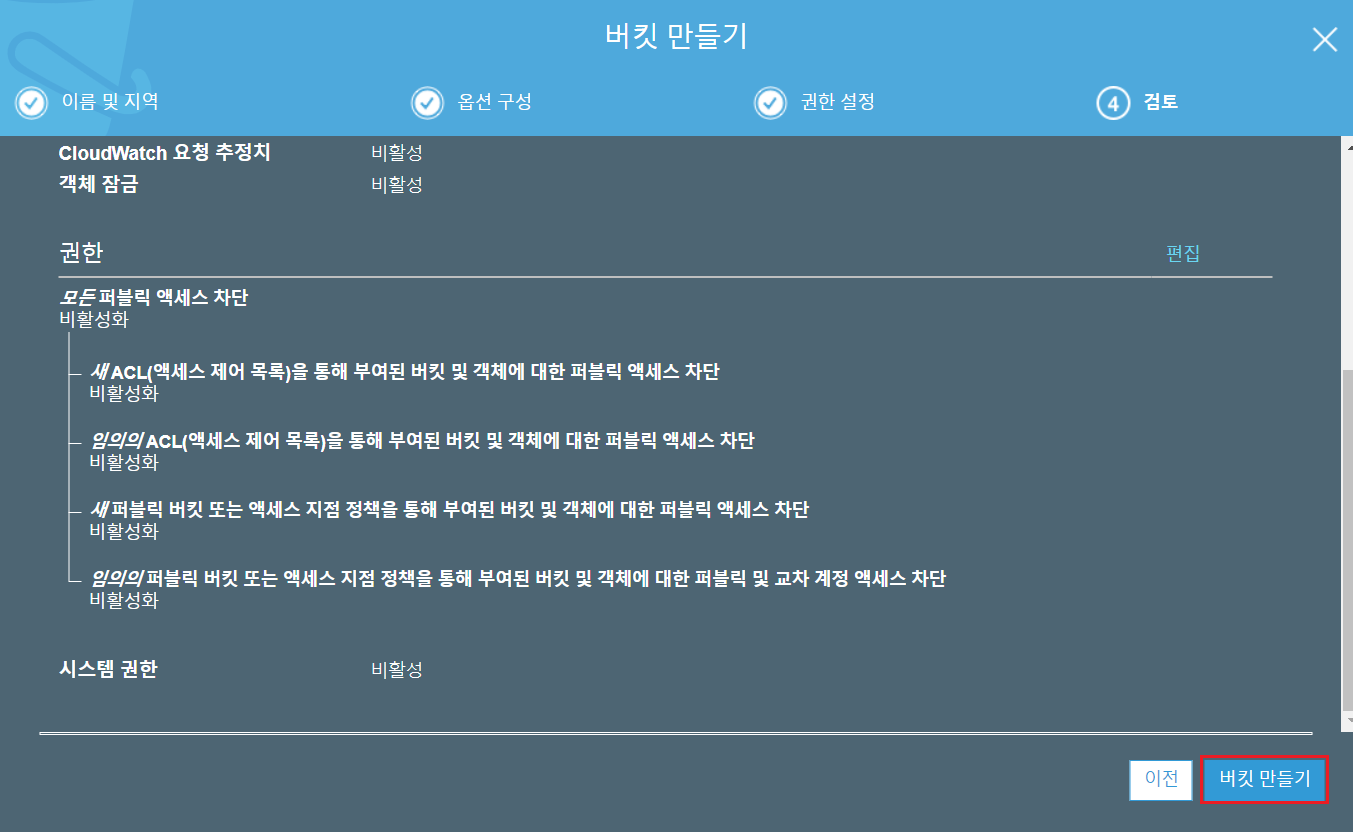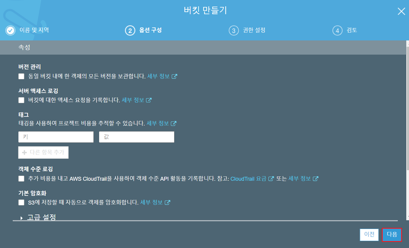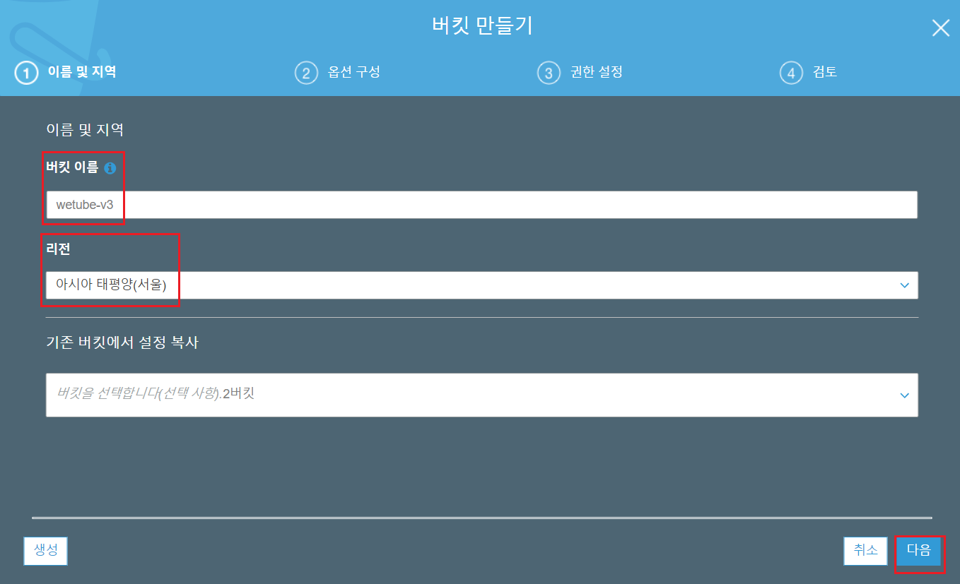버킷 이름(이름은 하고 싶은 것을 해도 된다.)과 리전을 다음과 설정한다. 그리고 '다음'