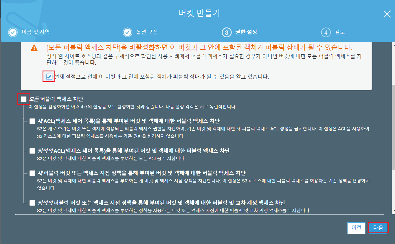 wetube는 모든 사용자가 video와 avatar를 업로드할 수 있어야 하기 때문에 bucket에 접근할 수 있어야 한다. 그러므로 나는 '모든 퍼블릭 액세스 차단'을 해제 하고 위 경고 창에 대해서 동의 체크를 한다. 그리고 '다음' 클릭.