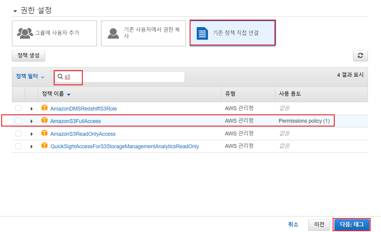 '기존 정책 직접 연결' -> 정책 필터에서 s3 검색 -> AmazonS3FullAccess를 선택 -> '다음:태그' 클릭한다.